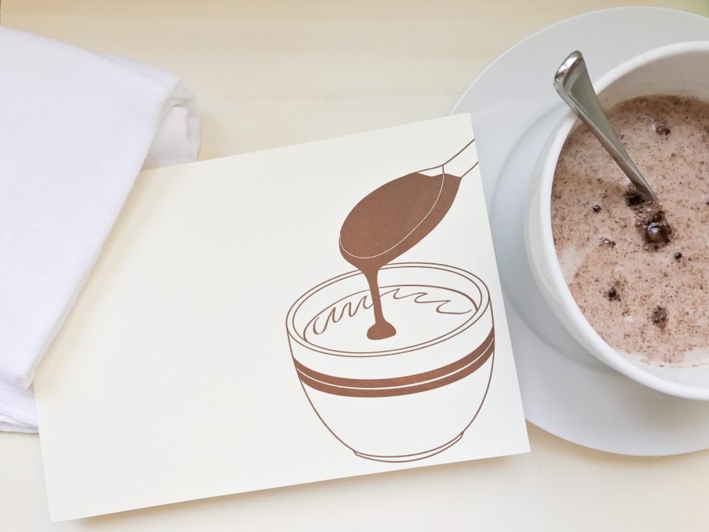 Des articles du quotidien imprimés à la main — serviettes de table, carnets et autres objets imprimés avec les tampons que j’ai moi-même dessinés et gravés. Chaque motif est unique parce que chaque tampon l’est.